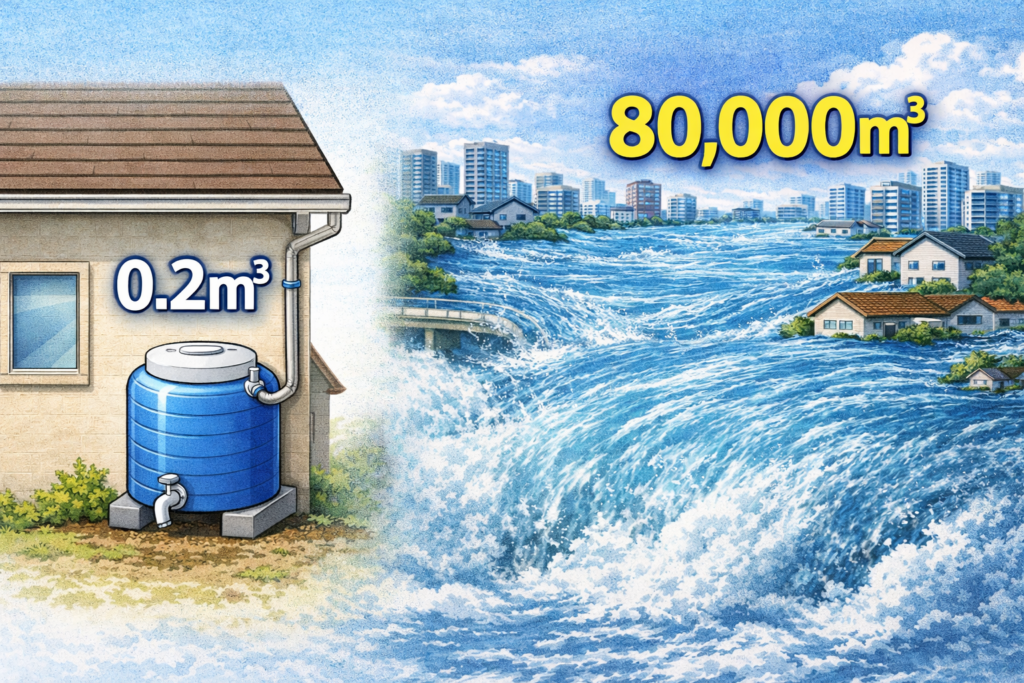 という難点に加えて、そもそも水害対策全体から見たときに、タンク1台あたりの標準的な容量(200L)はあまりにも“ちっぽけ”なんです。
