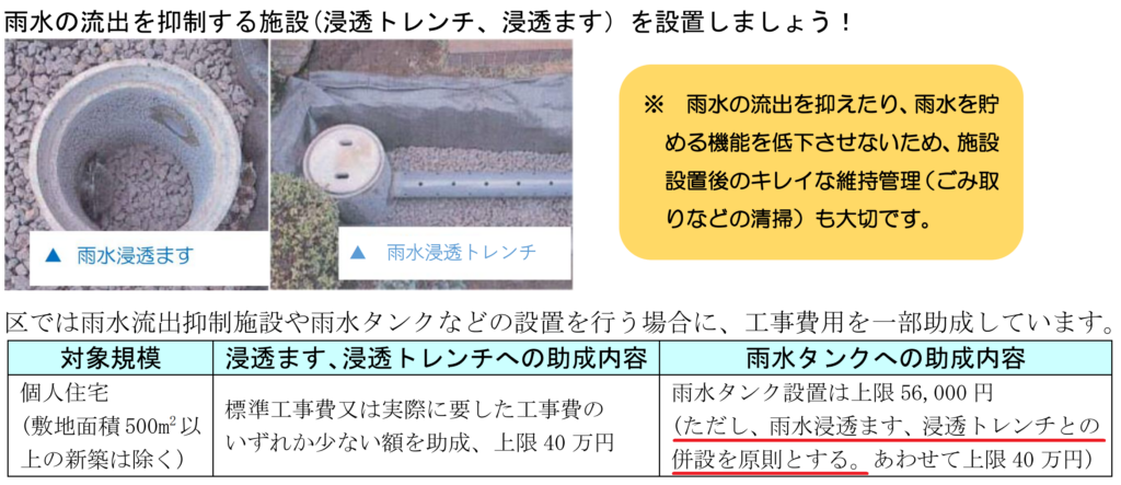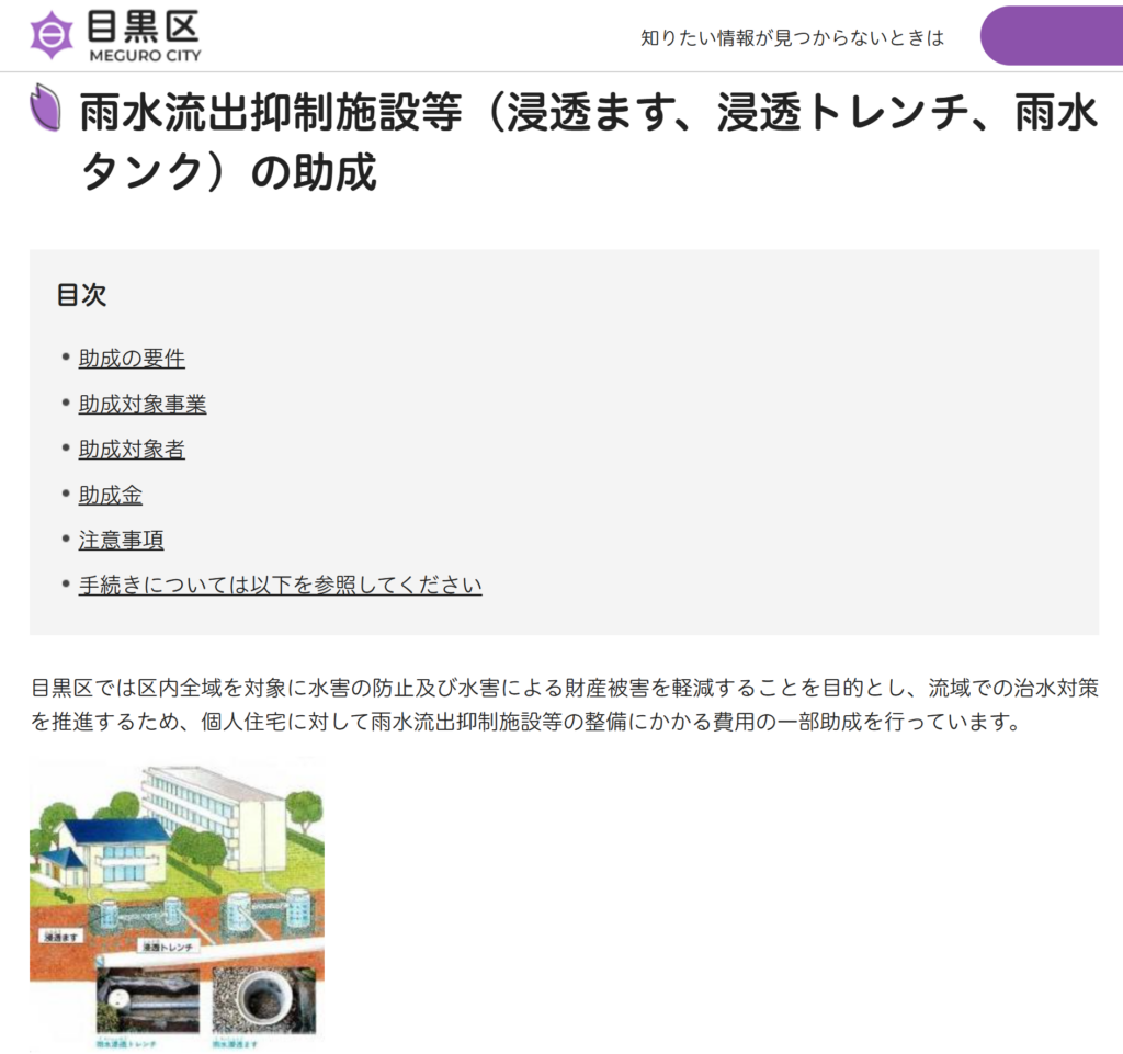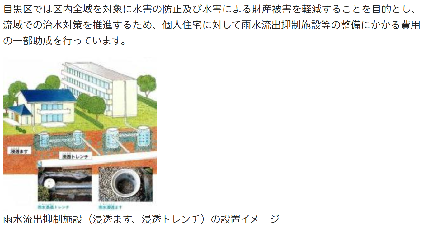 目黒区HP「雨水流出抑制施設等(浸透ます、浸透トレンチ、雨水タンク)の助成