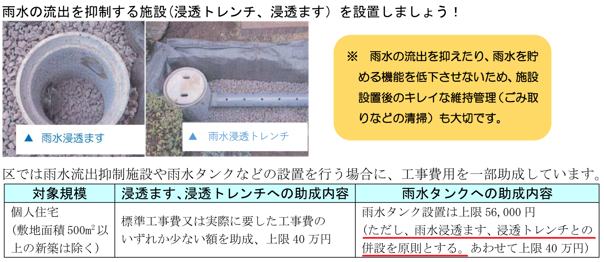 浸透ます、トレンチのイメージと、雨水タンクの助成要件(赤線部)(目黒区『豪雨対策計画』P54より一部改変)