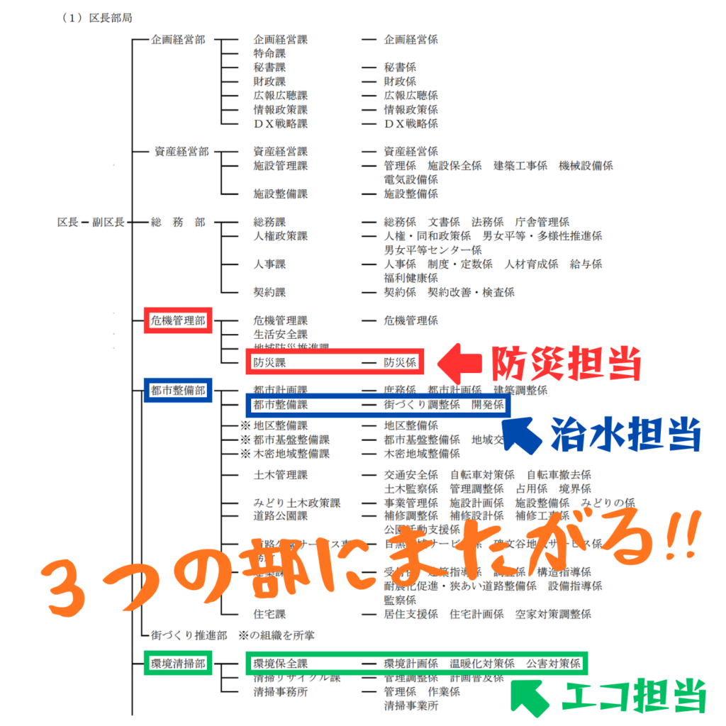 都市整備部(治水担当)の事業を、危機管理部(防災担当)や環境清掃部(エコ担当)的な観点でPRするということすらも進まない「縦割り組織」が、今の目黒区なのです。