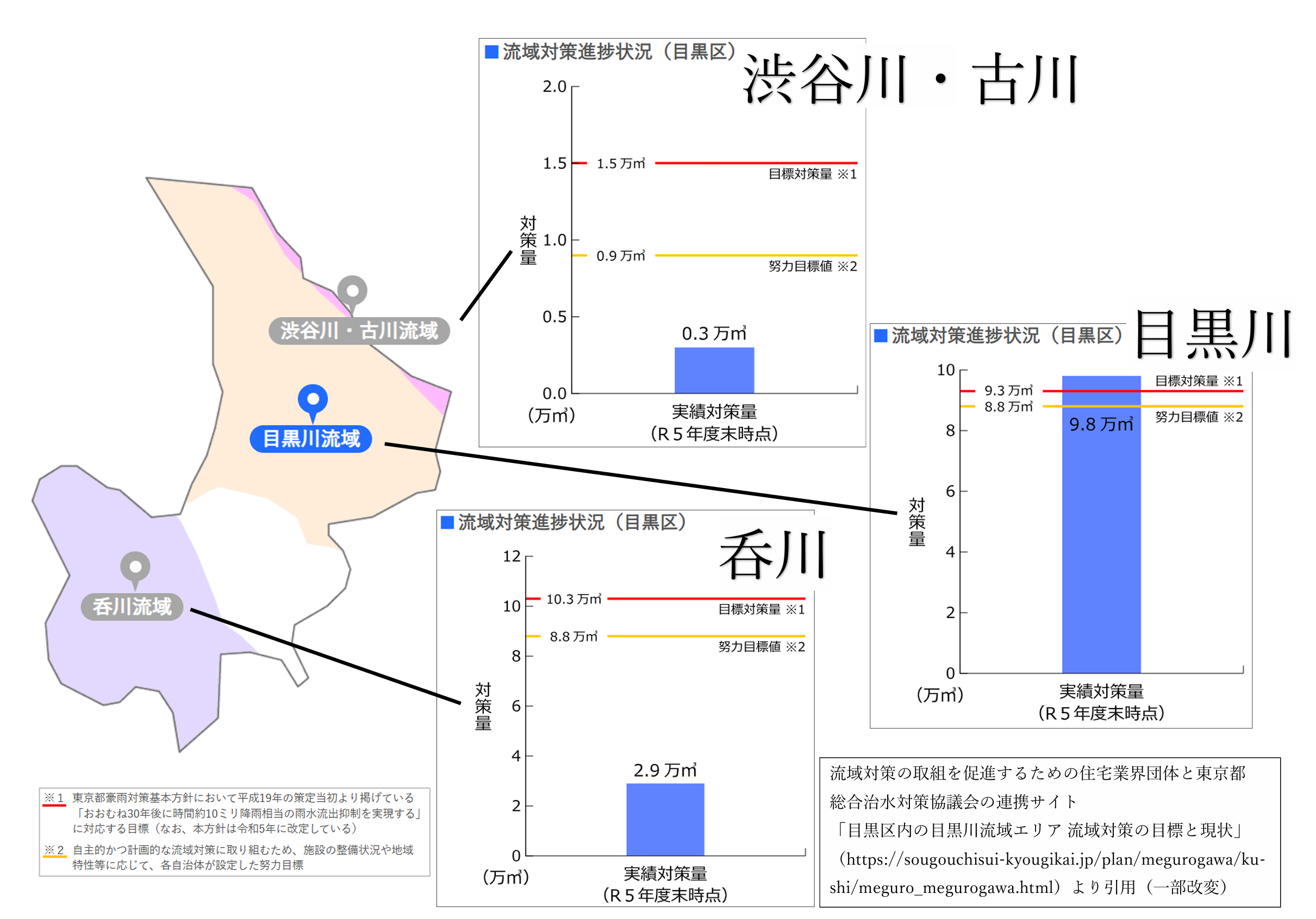 右の青い棒グラフが2024年3月時点で対策済みの量、赤い線が目標値です。これをみると目黒川流域では目標を達成しているものの、渋谷川や呑川流域ではまだ数万㎥レベルで対策が足りていないことがわかります。
